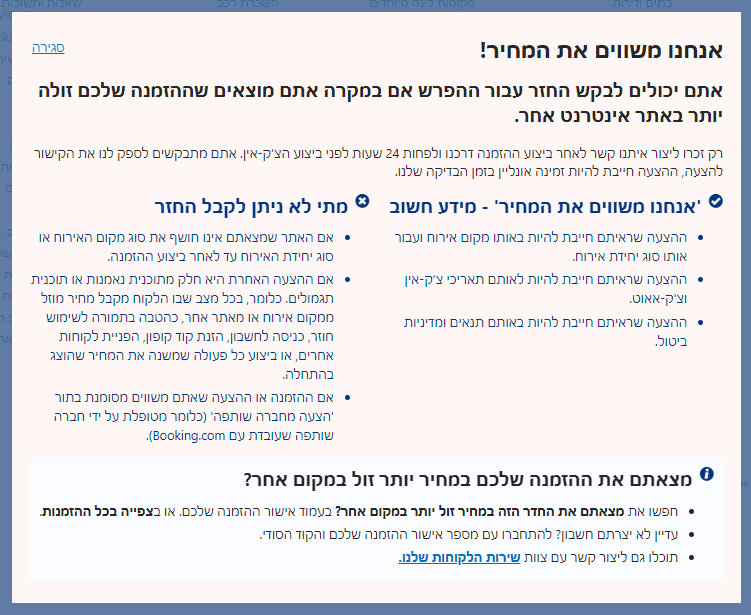 booking.com מבטיחים להשוות את המחיר לאתר מתחרה. מומלץ לקרוא את התנאים באתר כי יש פרטים שחשוב לדעת לפני שמגישים את הבקשה.