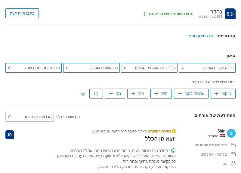 ניתן לסנן אותן לפי תאריך, דירוג, סוג הנופשים (משפחה, זוג וכדומה) ושפת האורח. חשוב לשים לב אם יש הרבה ביקורות חדשות בדירוג גבוה וגם לא להתרגש מביקורות שליליות (אבל חשוב לקרוא גם אותן). לפעמים אנשים נותנים ביקורת שלילית סתם כי היה להם יום פחות טוב או על דברים שלנו יראו כשטויות אז לא היינו פוסלים מלון רק בגלל כמה תגובות לא טובות.