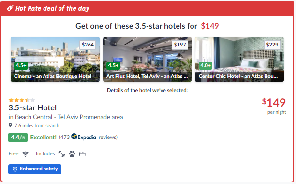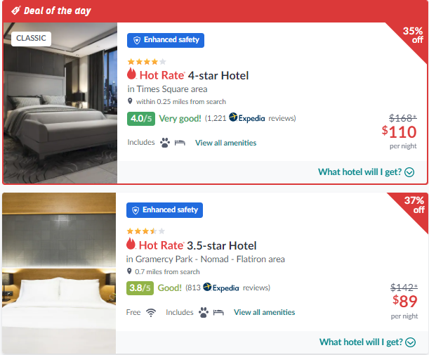 באתר hotwire.com מציעים אופציה נוספת של שלושה מלונות במחיר מוזל. תוכלו לראות באיזה מלונות מדובר, אבל תדעו מה המלון הנבחר רק לאחר ביצוע ההזמנה.
