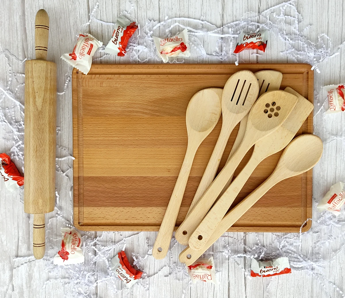 מארז מעץ הכולל קרש חיתוך, 6 כפות בישול ומערוך.