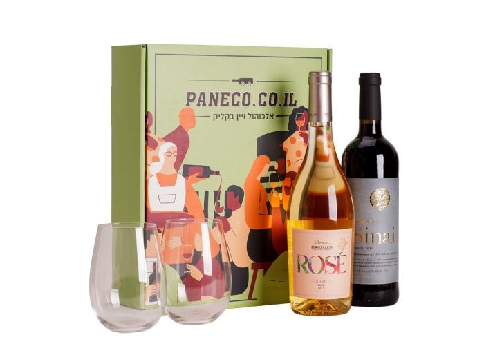 כולל 2 בקבוקי יין + זוג כוסות דקות